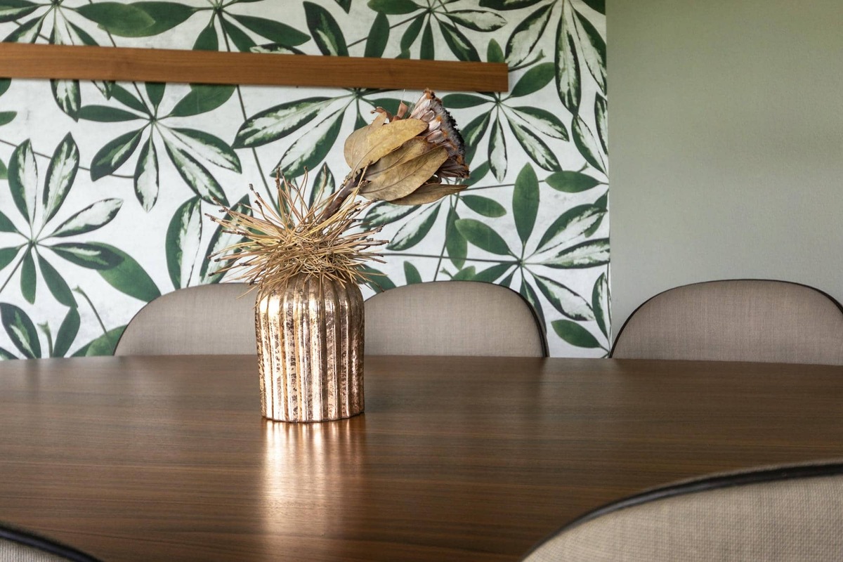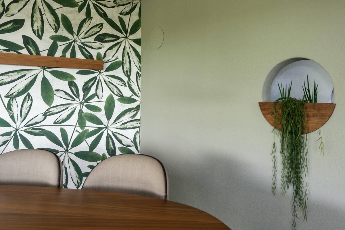Die Material- und Farbkombination bestehend aus Holz, Stein, Tapete und Pflanzen ergeben eine behagliche Wohnatmosphäre.